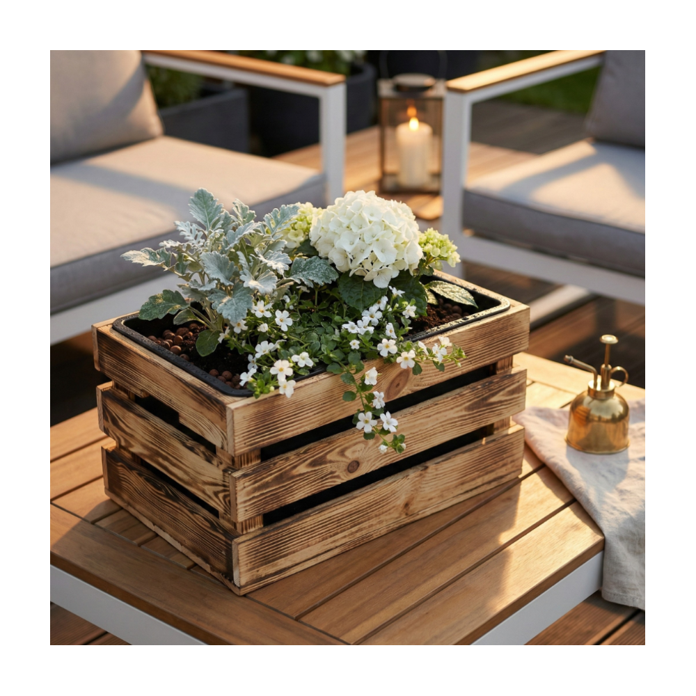 Drewniane skrzynki z naturalnego drewna sosnowego, dostępne w różnych rozmiarach i kolorach. Idealne do przechowywania, ekspozycji i dekoracji w domu, ogrodzie lub przestrzeniach komercyjnych. Ażurowe boki, pełne dno i ergonomiczne uchwyty zapewniają funkcjonalność i wygodę użytkowania. Produkt polski, certyfikowany FSC®.