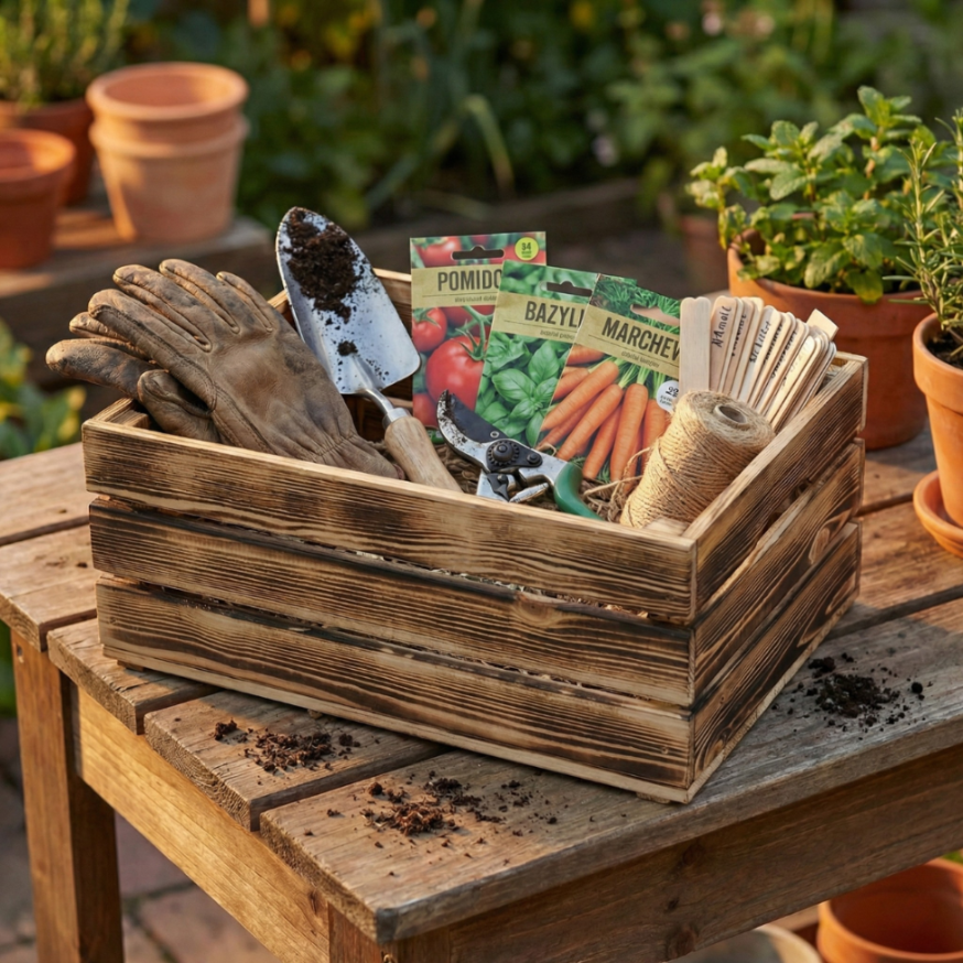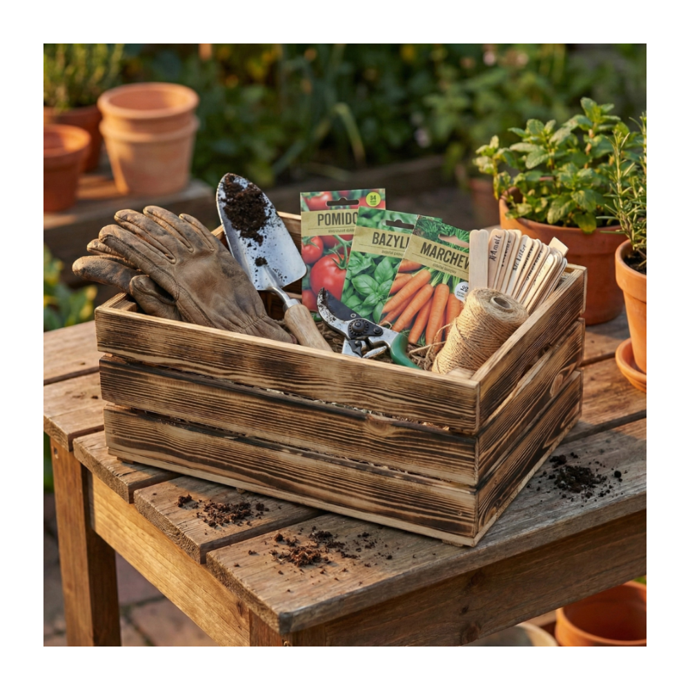 Drewniane skrzynki z naturalnego drewna sosnowego, dostępne w różnych rozmiarach i kolorach. Idealne do przechowywania, ekspozycji i dekoracji w domu, ogrodzie lub przestrzeniach komercyjnych. Ażurowe boki, pełne dno i ergonomiczne uchwyty zapewniają funkcjonalność i wygodę użytkowania. Produkt polski, certyfikowany FSC®.