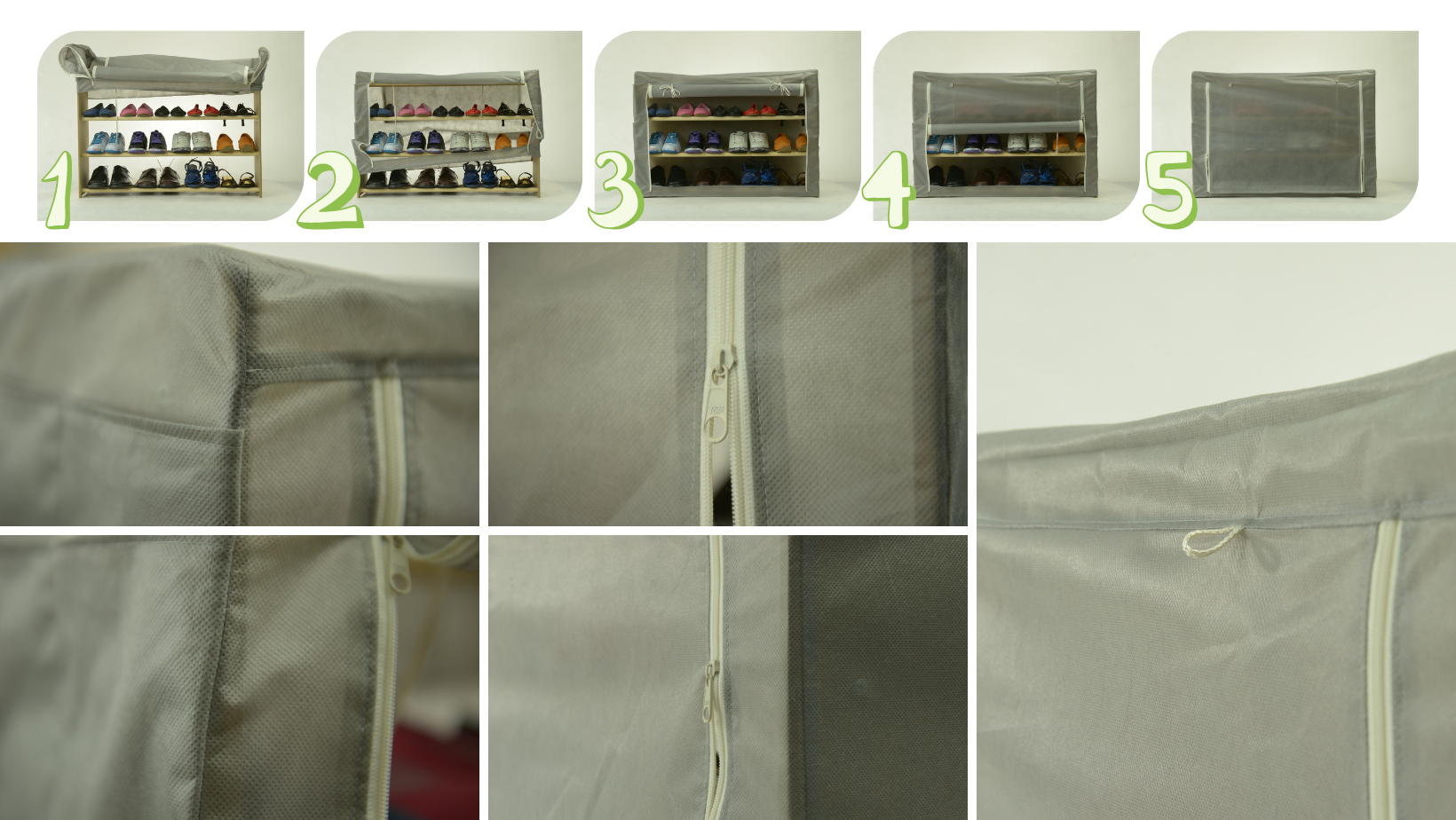 Opcjonalnie: pokrowce na regały – przewiewna flizelina chroniąca buty przed kurzem (kurtyna rolowana, otwieranie na suwaki).